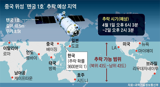 中 우주정거장 톈궁1호, 일요일 추락 예상